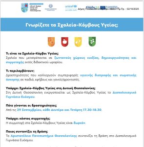 Το Διαπολιτισμικό Γυμνάσιο Ευόσμου μετατρέπεται σε Σχολείο-Κόμβο Υγείας, φιλοξενώντας ένα πλούσιο πρόγραμμα δραστηριοτήτων το οποίο στοχεύει στην πρόληψη και την αντιμετώπιση της παιδικής παχυσαρκίας. Από τον Νοέμβριο έως τις 17 Δεκεμβρίου 2025, κάθε Δευτέρα και Τετάρτη, παιδιά, έφηβοι, γονείς, εκπαιδευτικοί αλλά και κάθε ενδιαφερόμενος πολίτης, θα έχουν την ευκαιρία να συμμετάσχουν σε δράσεις που συνδυάζουν …