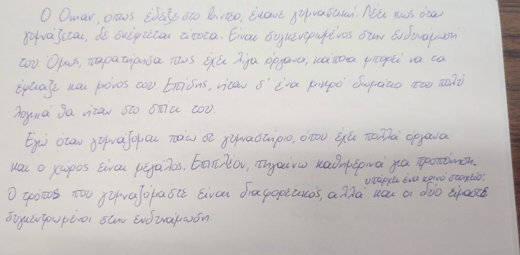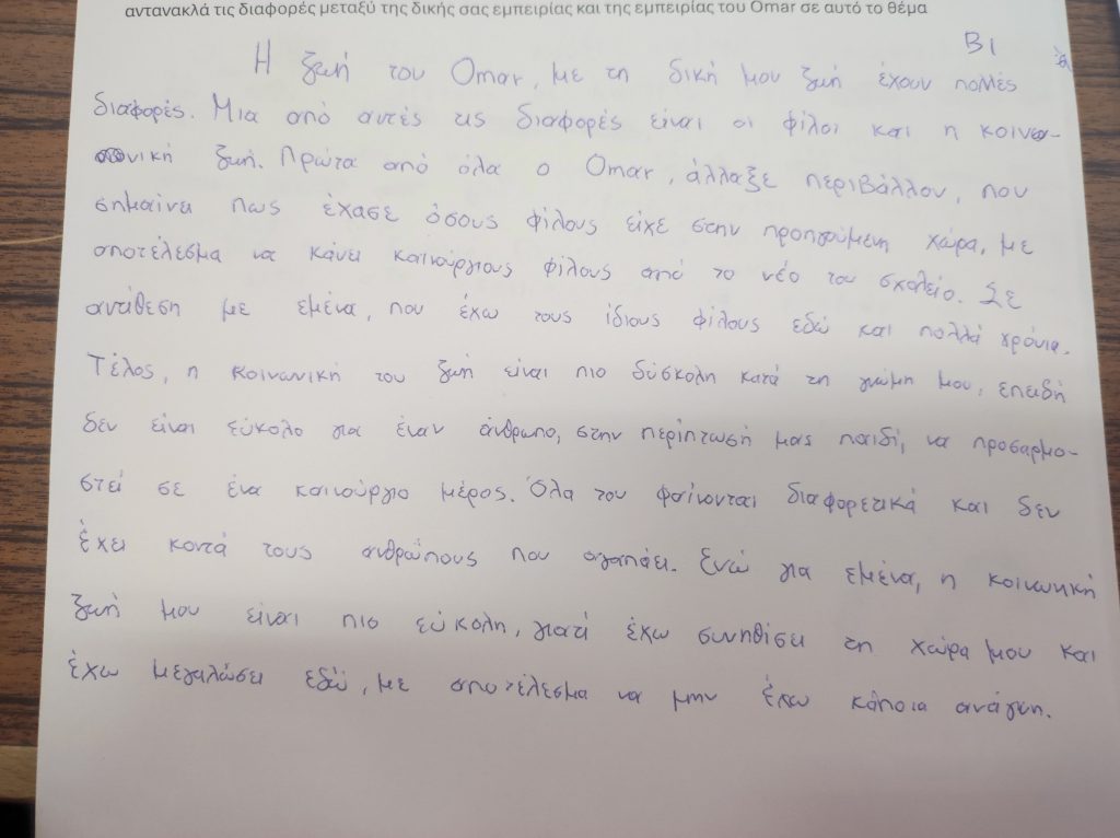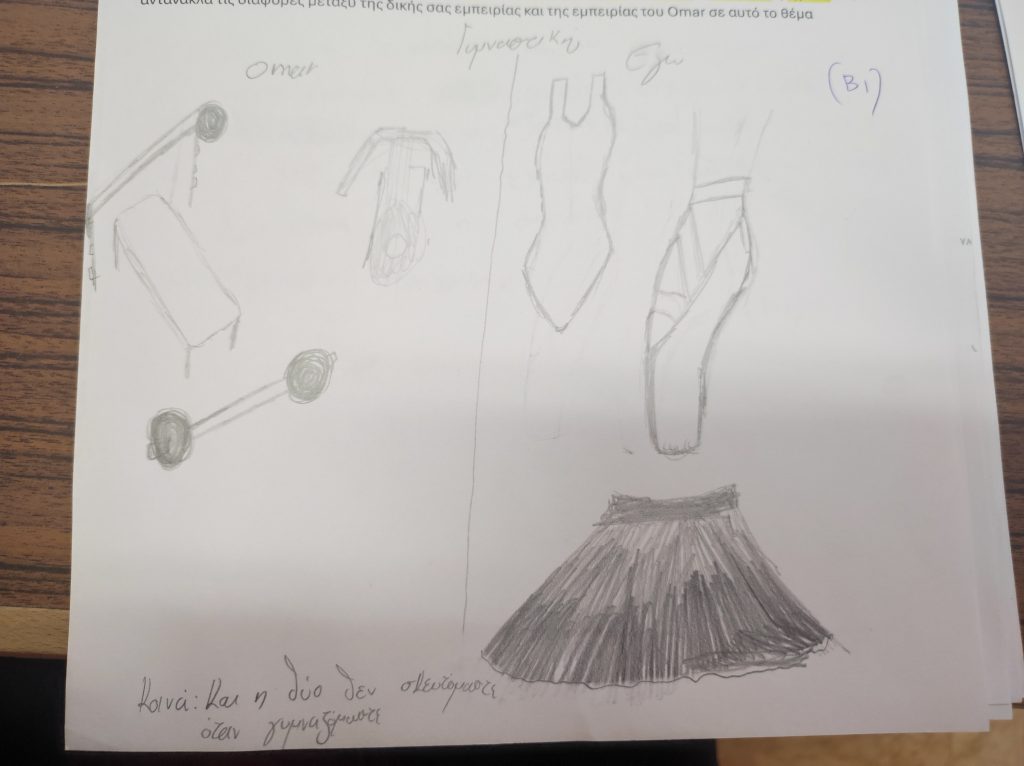 Στη συνέχεια, οι μαθητές συμμετείχαν σε βιωματικές δραστηριότητες με στόχο την ανάπτυξη της κριτικής και δημιουργικής τους σκέψης: κατέγραψαν ομοιότητες και διαφορές ανάμεσα στη δική τους ζωή και σε εκείνη του Ομάρ, ενώ κάποιοι αποτύπωσαν εικαστικά τις εντυπώσεις και τα συναισθήματά τους μέσα από ζωγραφιές. Μέσα από τη διαδικασία αυτή, ενισχύθηκε ο διάλογος, η συνεργασία και η κατανόηση σημαντικών κοινωνικών ζητημάτων.