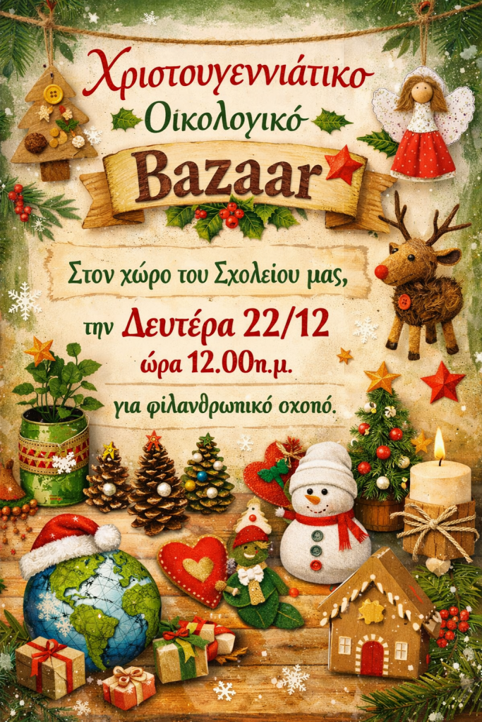 Στον χώρο του σχολείου μας θα διοργανωθεί Χριστουγεννιάτικο Bazaar τη Δευτέρα 22/12 και από ώρα 12:00 μ.μ..