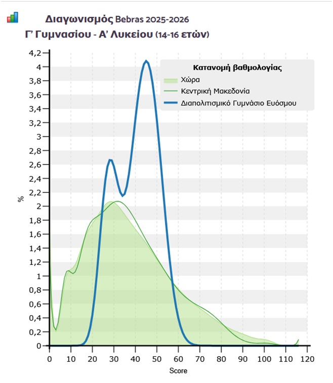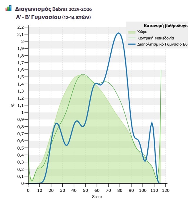 Γενικά οι μαθητές μας πήγαν πολύ καλά με βάση την πανελλήνια κατανομή βαθμολογίας και κυρίως στη Β’ Γυμνασίου με τους περισσότερους μαθητές να έχουν βαθμολογία γύρω στο 80 αλλά και στη Γ΄ με βαθμολογία 45.
